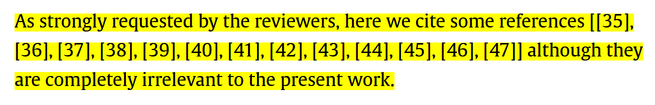 In a more sinister way, reviewers from these academic journals often require citation of their own or related work. It is not always as explicit as in the real example below, but many people looking to publish in these journals implicitly understand that this increases the probability of getting their articles accepted.